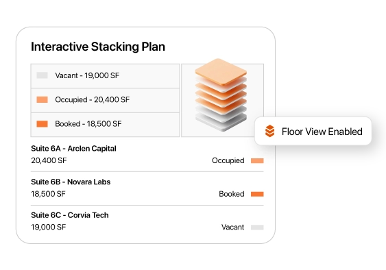 StackPlanner uses interactive building stack views to visually display occupied, vacant, and soon-to-be-available spaces. Property owners can instantly see occupancy levels and vacancy exposure, making it easier to assess asset performance and identify revenue opportunities.